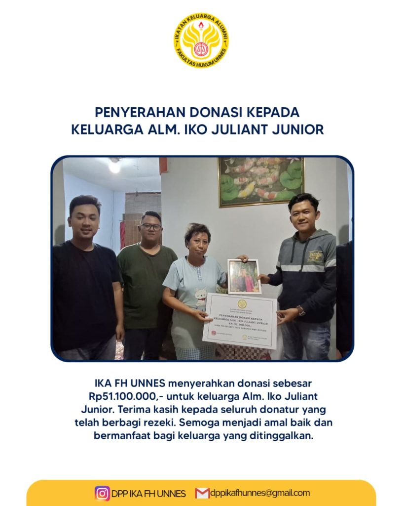 Semarang, 27 September 2025 – Ikatan Keluarga Alumni Fakultas Hukum Universitas Negeri Semarang (IKA FH UNNES) telah menyerahkan hasil penggalangan donasi kepada keluarga almarhum Iko Juliant Junior pada Sabtu (27/9). Penyerahan dilakukan oleh Am Adzkiyya’ Amiruddin (Sekretaris Jenderal), Ady Putra Cesario (Ketua PBH), Naufal Sebastian (Sekretaris PBH), dan Imron Safii (Anggota PBH).